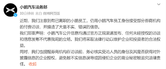 12月2日音书,小鹏汽车法务部发布微博示意,近期,有已下野的小鹏职工,仍用小鹏汽车职工身份接受部分券商机构的付费访谈,并虚构了多数作假、虚假的信息。并声明小鹏汽车公开信息均通过官清廉规渠说念发布,任何未经授权的访谈和信息发布不代表公司态度。